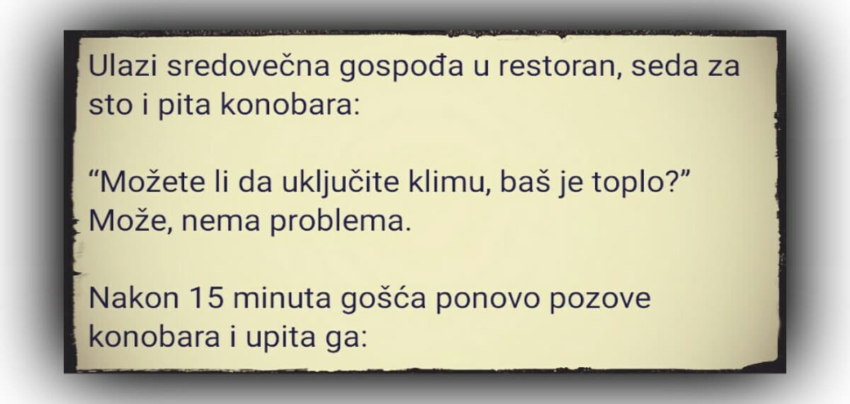 Ulazi sredovečna gospođa u restoran, seda za sto i pita konobara: