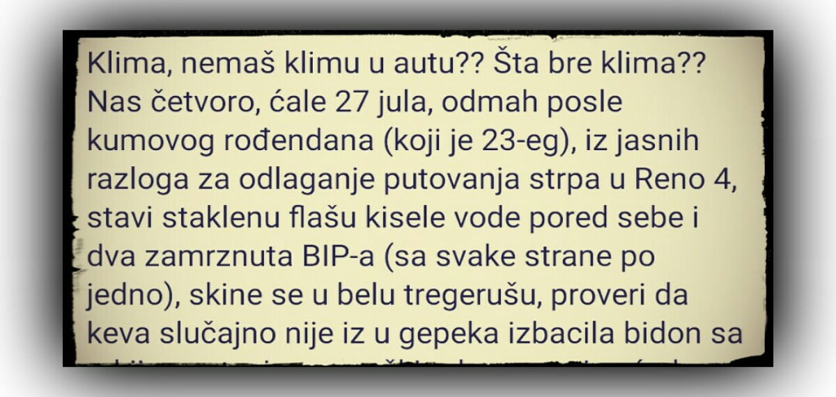 Klima, nemaš klimu u autu?? Šta bre klima?? Nas četvoro, ćale 27 jula, odmah posle kumovog rođendana (koji je 23-eg), iz jasnih razloga za odlaganje…