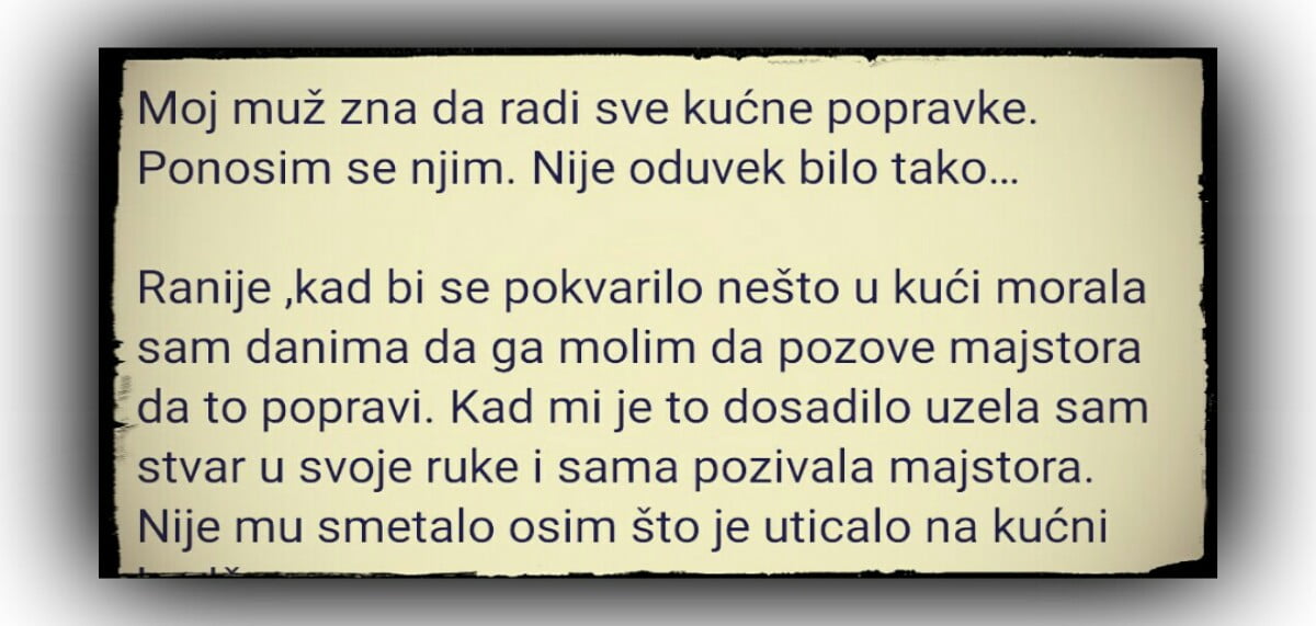 Moj muž zna da radi sve kućne popravke. Ponosim se njim. Nije oduvek bilo tako… Ranije ,kad bi se pokvarilo nešto u kući morala sam…