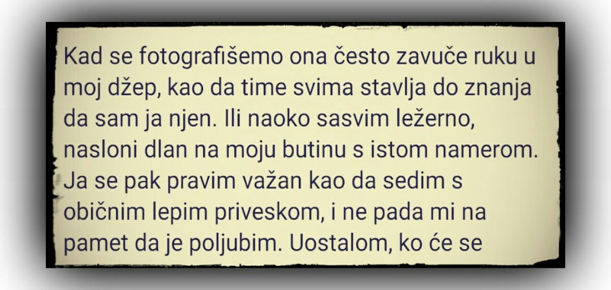 Kad se fotografišemo ona često zavuče ruku u moj džep, kao da time svima stavlja do znanja da sam ja njen. Ili naoko sasvim ležerno,…