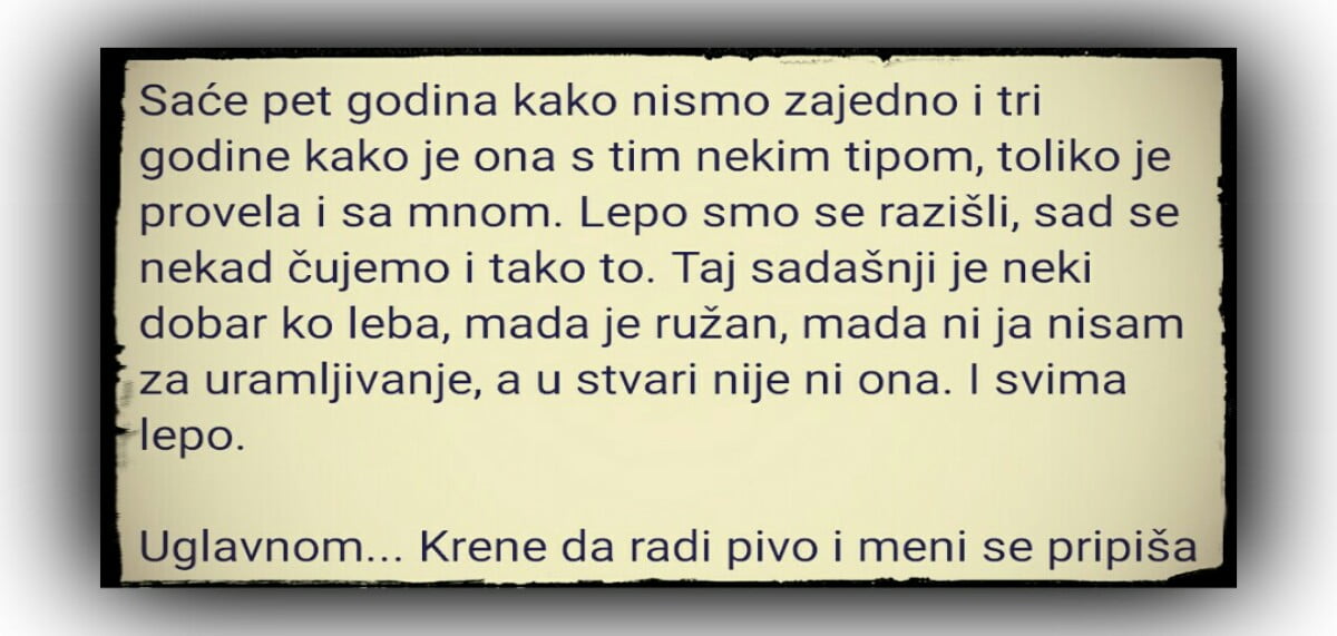 Saće pet godina kako nismo zajedno i tri godine kako je ona s tim nekim tipom, toliko je provela i sa mnom. Lepo smo se…