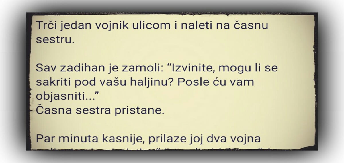 Trči jedan vojnik ulicom i naleti na časnu sestru. Sav zadihan je zamoli: “Izvinite, mogu li se sakriti pod vašu haljinu? Posle ću vam objasniti…”…