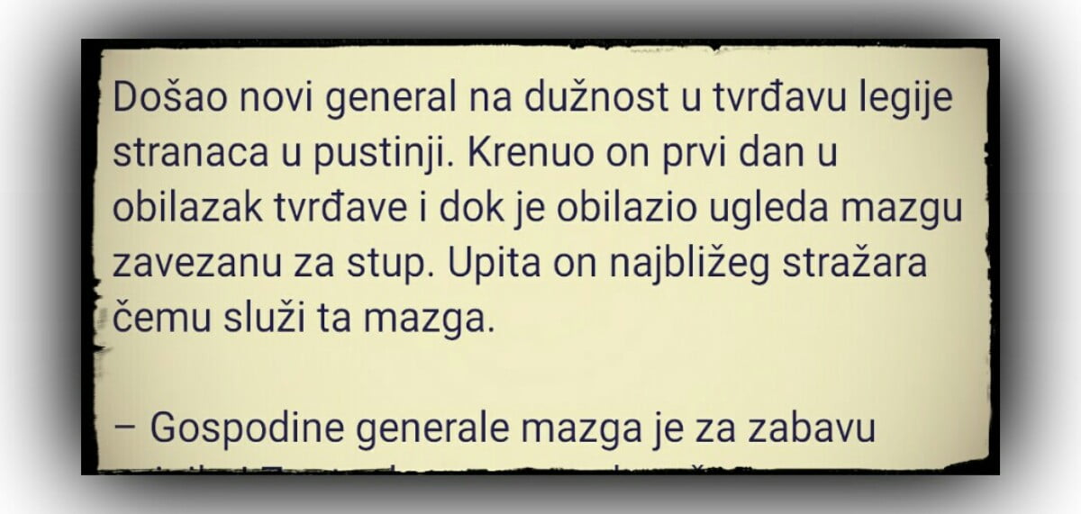 Došao novi general na dužnost u tvrđavu legije stranaca u pustinji. Krenuo on prvi dan u obilazak tvrđave i dok je obilazio ugleda mazgu zavezanu…