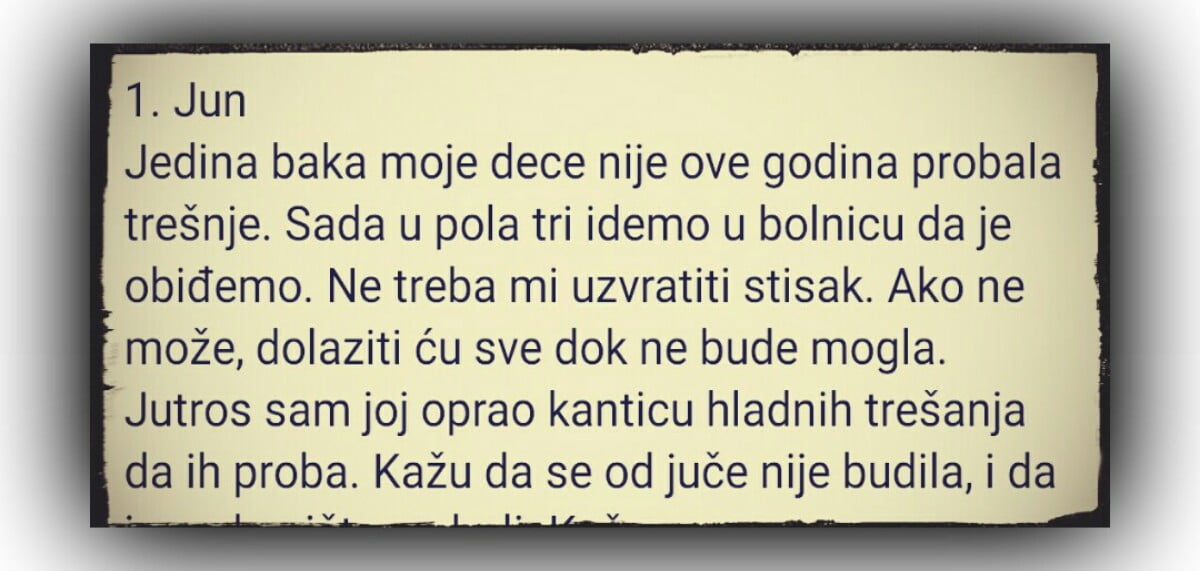 1. Jun Jedina baka moje dece nije ove godina probala trešnje. Sada u pola tri idemo u bolnicu da je obiđemo. Ne treba mi uzvratiti…