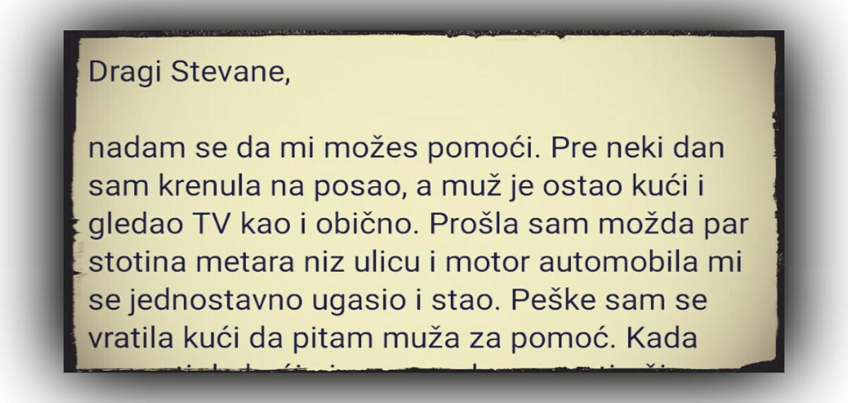 Dragi Stevane, nadam se da mi možes pomoći. Pre neki dan sam krenula na posao, a muž je ostao kući i gledao TV kao i…