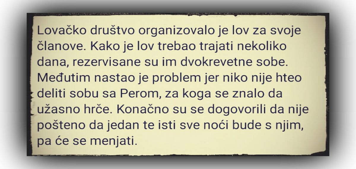 Lovačko društvo organizovalo je lov za svoje članove. Kako je lov trebao trajati nekoliko dana, rezervisane su im dvokrevetne sobe. Međutim nastao je problem jer…