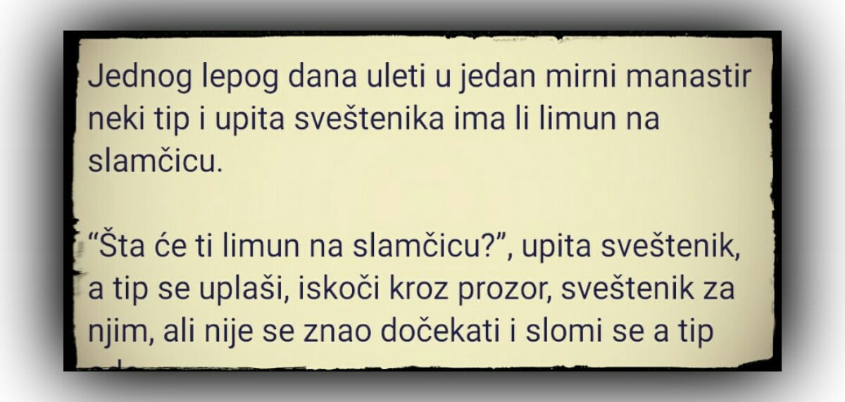 Jednog lepog dana uleti u jedan mirni manastir neki tip i upita sveštenika ima li limun na slamčicu. “Šta će ti limun na slamčicu?”, upita…