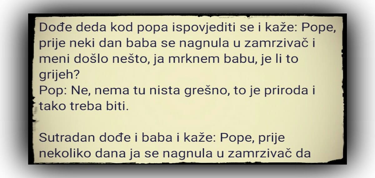 Dođe deda kod popa ispovjediti se i kaže: Pope, prije neki dan baba se nagnula u zamrzivač i meni došlo nešto, ja mrknem babu, je li to grijeh?