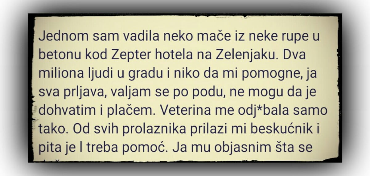 Jednom sam vadila neko mače iz neke rupe u betonu kod Zepter hotela na Zelenjaku. Dva miliona ljudi u gradu i niko da mi pomogne, ja sva prljava, valjam se po podu, ne mogu da je dohvatim i plačem. Veterina me odj*bala samo tako. Od svih prolaznika prilazi mi beskućnik i pita je l treba pomoć. Ja mu objasnim šta se dešava.