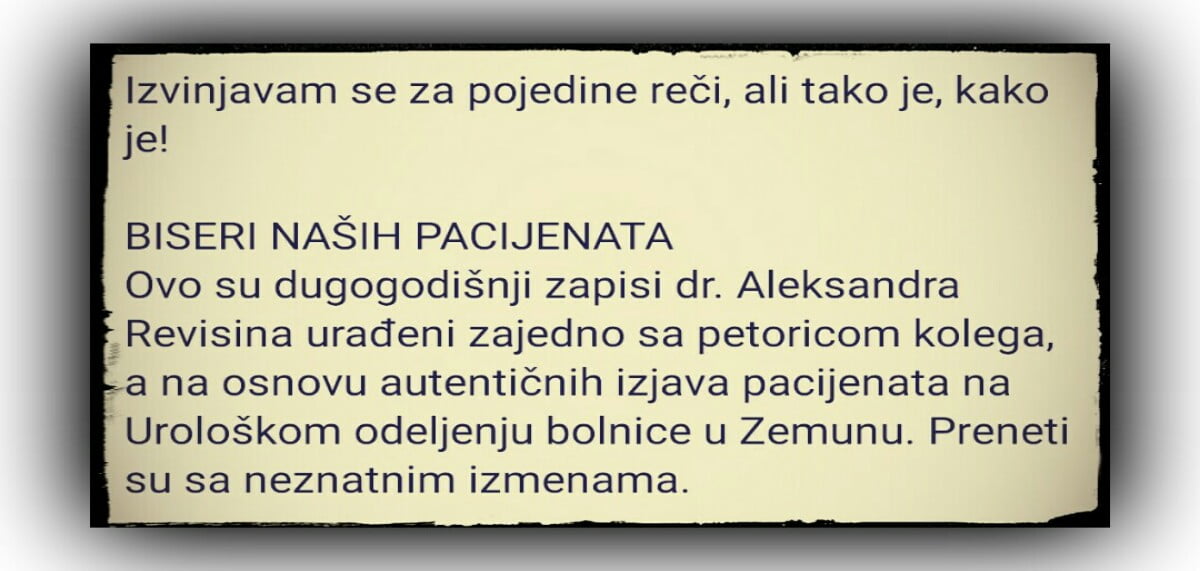 Ovo su dugogodišnji zapisi dr. Aleksandra Revisina urađeni zajedno sa petoricom kolega, a na osnovu autentičnih izjava pacijenata na Urološkom odeljenju bolnice u Zemunu. Preneti su sa neznatnim izmenama.