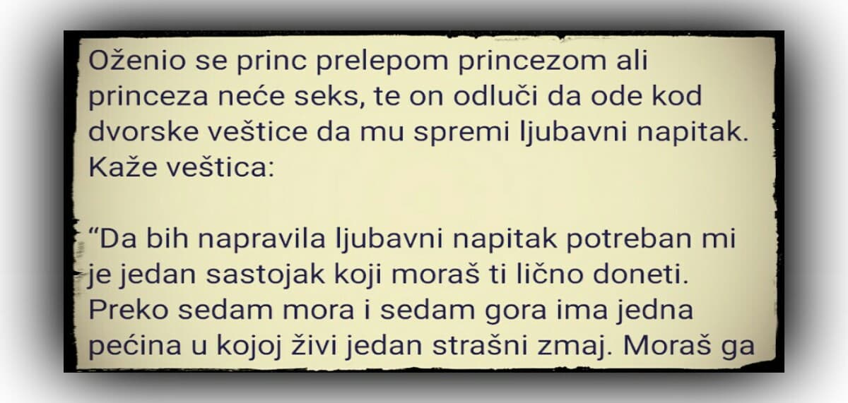 Oženio se princ prelepom princezom ali princeza neće s*ks, te on odluči da ode kod dvorske veštice da mu spremi ljubavni napitak. Kaže veštica: