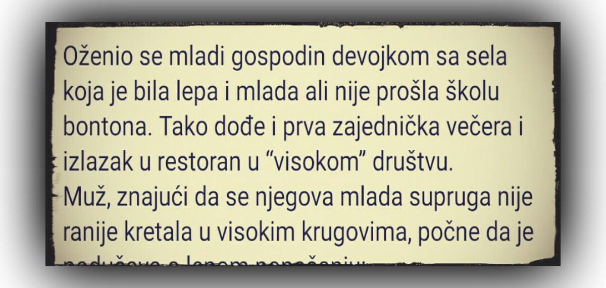 Oženio se mladi gospodin devojkom sa sela koja je bila lepa i mlada ali nije prošla školu bontona. Tako dođe i prva zajednička večera i izlazak u restoran u “visokom” društvu.
