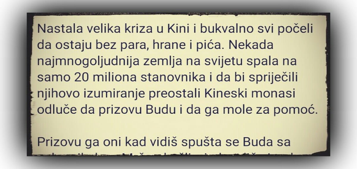 Nastala velika kriza u Kini i bukvalno svi počeli da ostaju bez para, hrane i pića. Nekada najmnogoljudnija zemlja na svijetu spala na samo 20 miliona stanovnika i da bi spriječili njihovo izumiranje preostali Kineski monasi odluče da prizovu Budu i da ga mole za pomoć.
