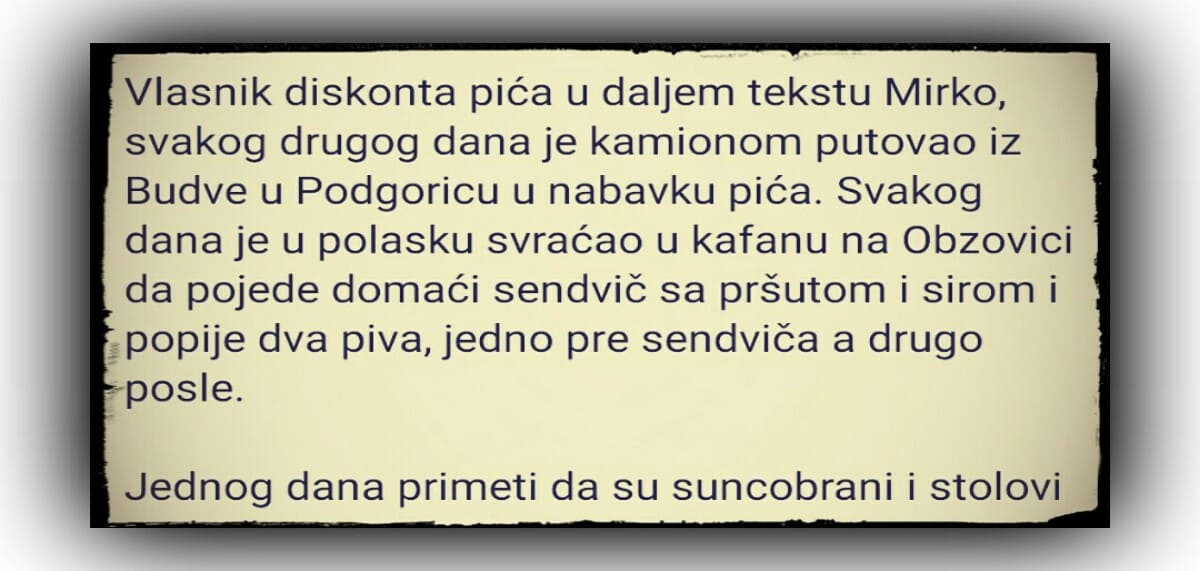 Vlasnik diskonta pića u daljem tekstu Mirko, svakog drugog dana je kamionom putovao iz Budve u Podgoricu u nabavku pića. Svakog dana je u polasku svraćao u kafanu na Obzovici da pojede domaći sendvič sa pršutom i sirom i popije dva piva, jedno pre sendviča a drugo posle.