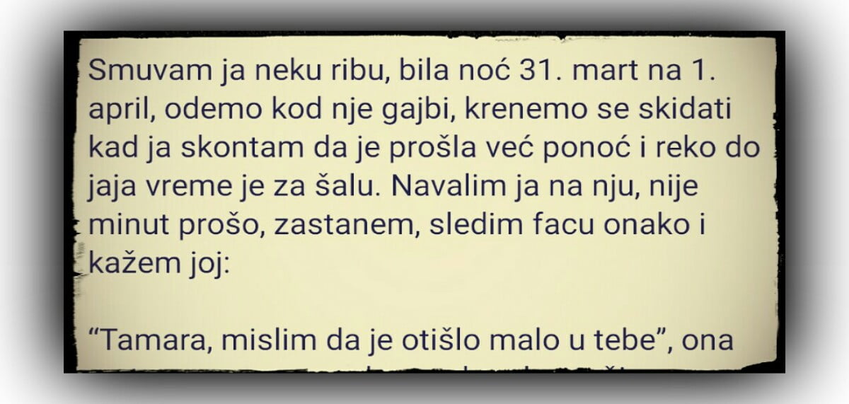 Smuvam ja neku ribu, bila noć 31. mart na 1. april, odemo kod nje gajbi, krenemo se skidati kad ja skontam da je prošla već ponoć i reko do jaja vreme je za šalu. Navalim ja na nju, nije minut prošo, zastanem, sledim facu onako i kažem joj: