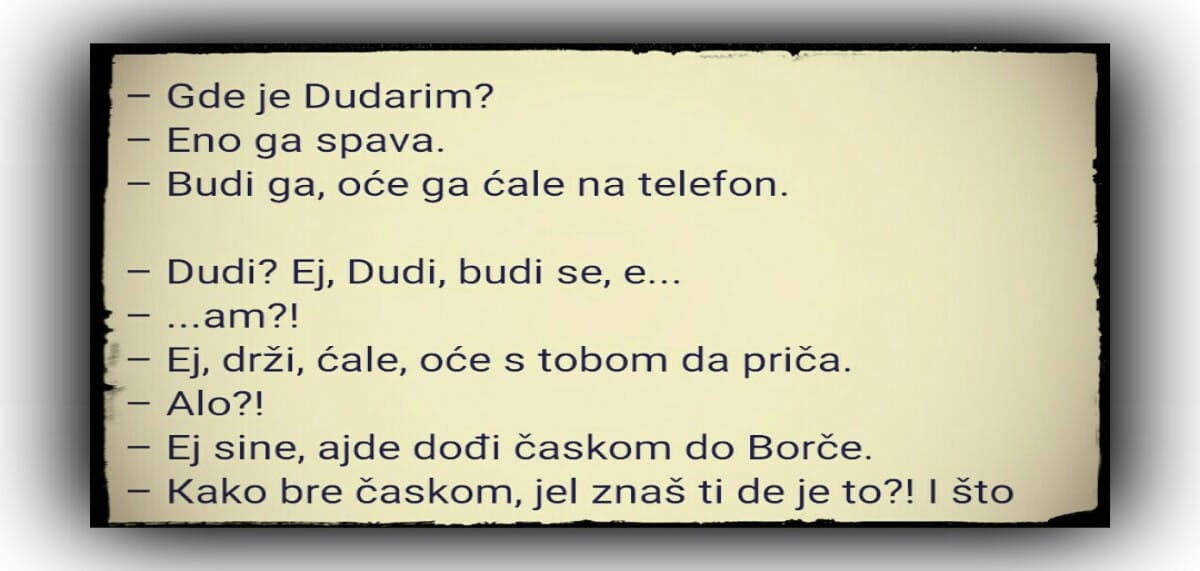 – Кako bre časkom, jel znaš ti de je to?! I što me bre budiš, znaš kad sam sinoć lego…