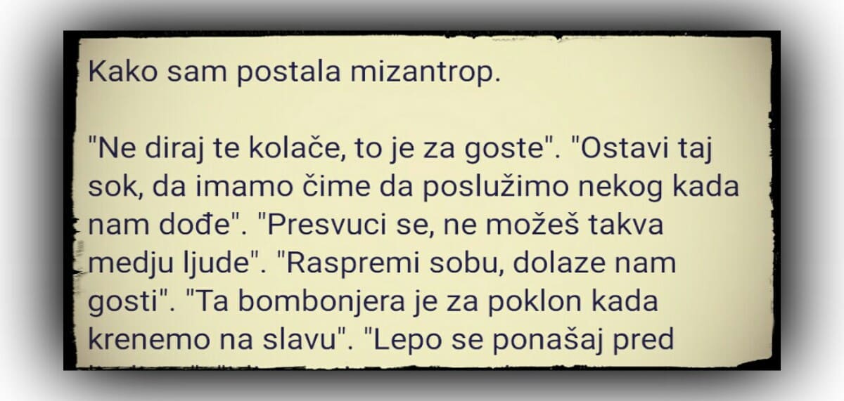 Kako sam postala mizantrop. “Ne diraj te kolače, to je za goste”. “Ostavi taj sok, da imamo čime da poslužimo nekog kada nam dođe”. “Presvuci…
