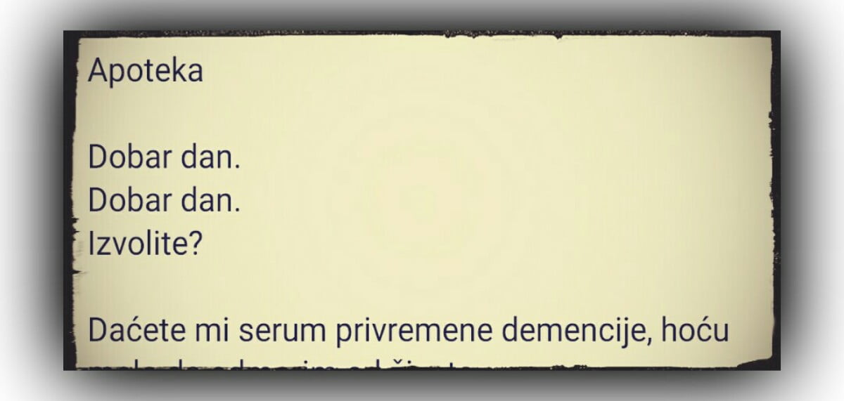 Apoteka Dobar dan. Dobar dan. Izvolite? Daćete mi serum privremene demencije, hoću malo da odmorim od života. Mmmmmmmmm. HAHAHAHAHHAAHHA. Ja se izvinjam. “Nije lepo smejati…