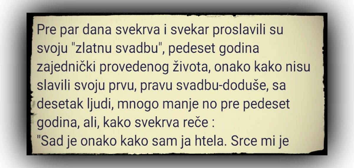 Pre par dana svekrva i svekar proslavili su svoju “zlatnu svadbu”, pedeset godina zajednički provedenog života, onako kako nisu slavili svoju prvu, pravu svadbu-doduše, sa…