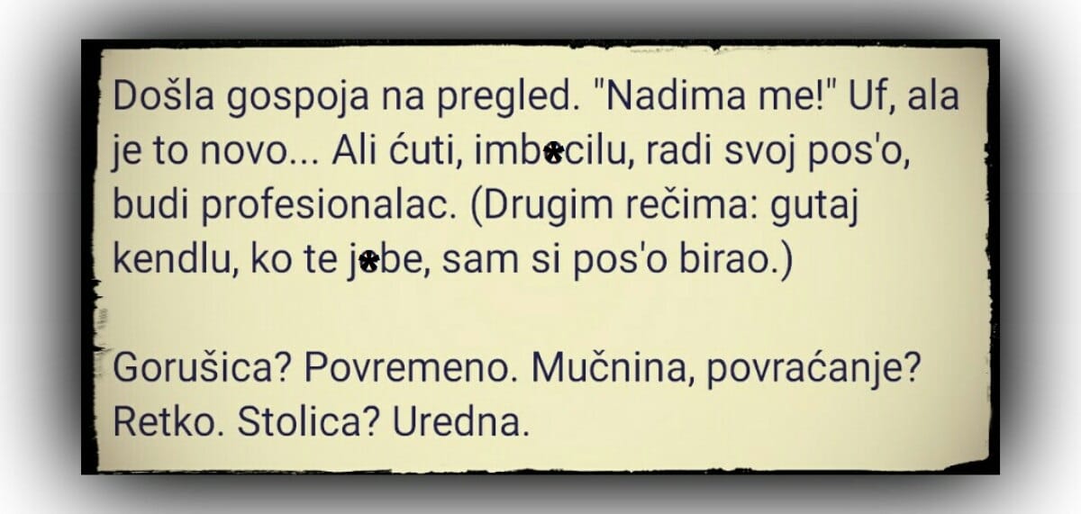 Došla gospoja na pregled. “Nadima me!” Uf, ala je to novo… Ali ćuti, imb*cilu, radi svoj pos’o, budi profesionalac. (Drugim rečima: gutaj kendlu, ko te…