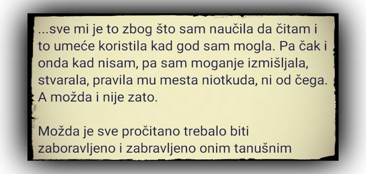 …sve mi je to zbog što sam naučila da čitam i to umeće koristila kad god sam mogla. Pa čak i onda kad nisam, pa…