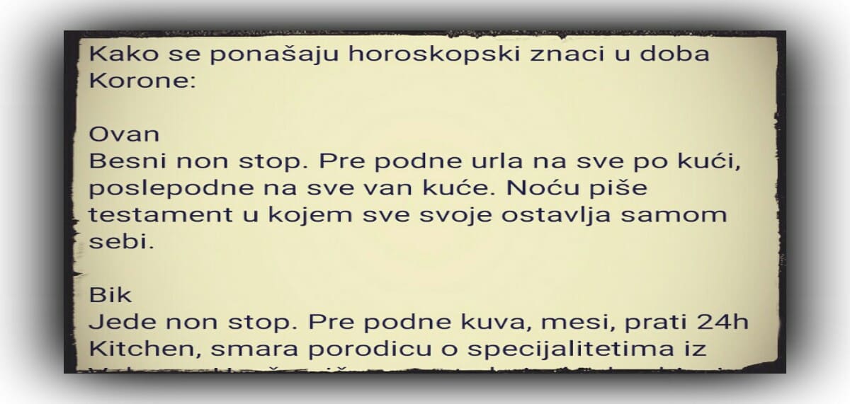 Kako se ponašaju horoskopski znaci u doba Korone: Ovan Besni non stop. Pre podne urla na sve po kući, poslepodne na sve van kuće. Noću…