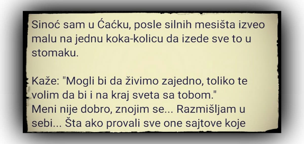 Sinoć sam u Ćaćku, posle silnih mesišta izveo malu na jednu koka-kolicu da izede sve to u stomaku. Kaže: “Mogli bi da živimo zajedno, toliko…