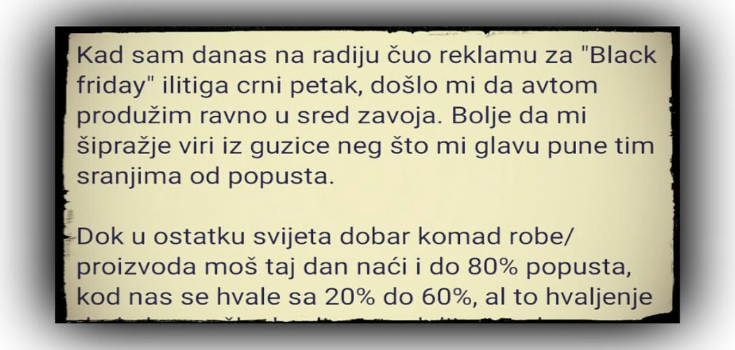 Kad sam danas na radiju čuo reklamu za “Black friday” ilitiga crni petak, došlo mi da avtom produžim ravno u sred zavoja. Bolje da mi…