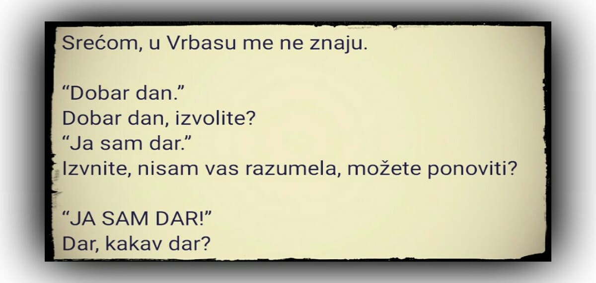 Srećom, u Vrbasu me ne znaju. “Dobar dan.” Dobar dan, izvolite? “Ja sam dar.” Izvnite, nisam vas razumela, možete ponoviti? “JA SAM DAR!” Dar, kakav…