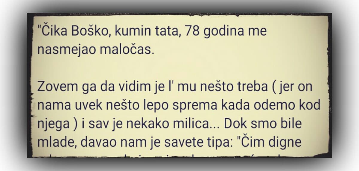 “Čika Boško, kumin tata, 78 godina me nasmejao maločas. Zovem ga da vidim je l’ mu nešto treba ( jer on nama uvek nešto lepo…