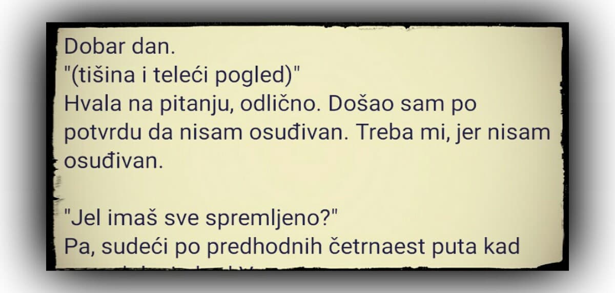 Dobar dan. “(tišina i teleći pogled)” Hvala na pitanju, odlično. Došao sam po potvrdu da nisam osuđivan. Treba mi, jer nisam osuđivan. “Jel imaš sve…