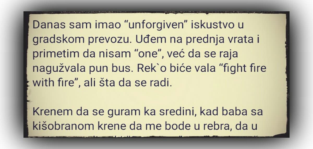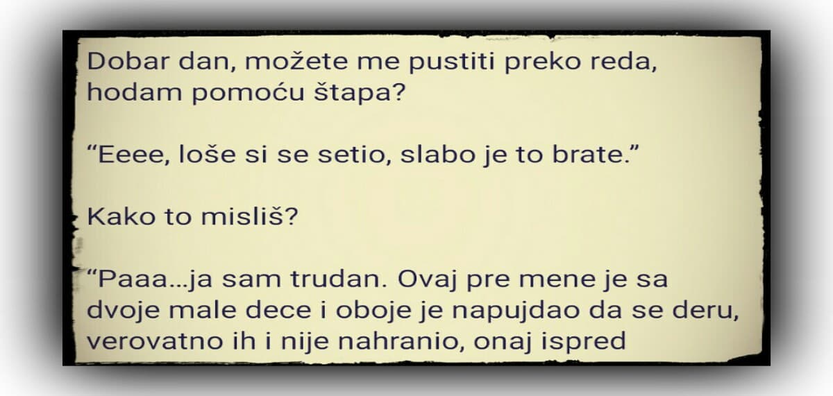 Dobar dan, možete me pustiti preko reda, hodam pomoću štapa? “Eeee, loše si se setio, slabo je to brate.” Kako to misliš? “Paaa…ja sam trudan.…