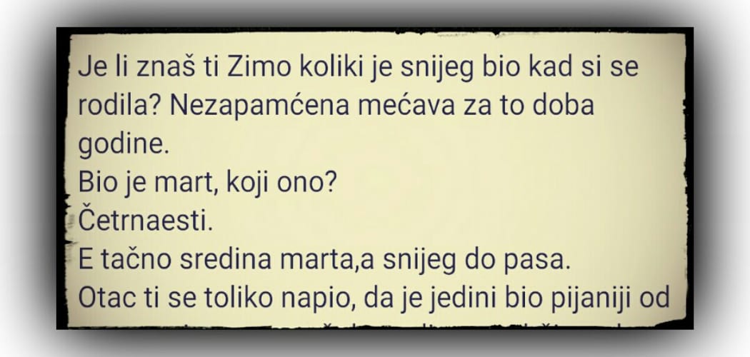 Je li znaš ti Zimo koliki je snijeg bio kad si se rodila? Nezapamćena mećava za to doba godine. Bio je mart, koji ono? Četrnaesti.…