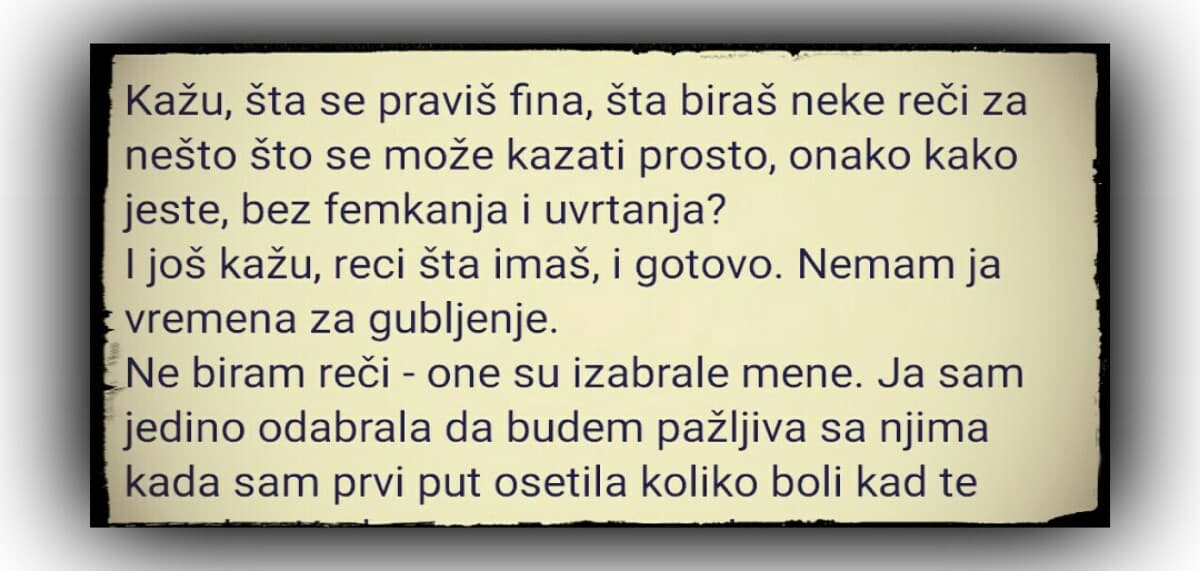 Kažu, šta se praviš fina, šta biraš neke reči za nešto što se može kazati prosto, onako kako jeste, bez femkanja i uvrtanja? I još…