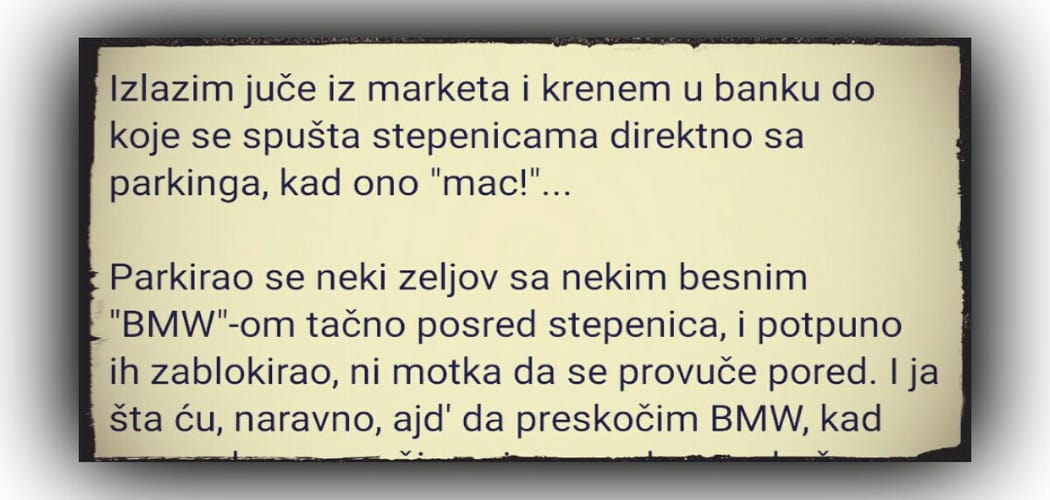 Izlazim juče iz marketa i krenem u banku do koje se spušta stepenicama direktno sa parkinga, kad ono “mac!”… Parkirao se neki zeljov sa nekim…