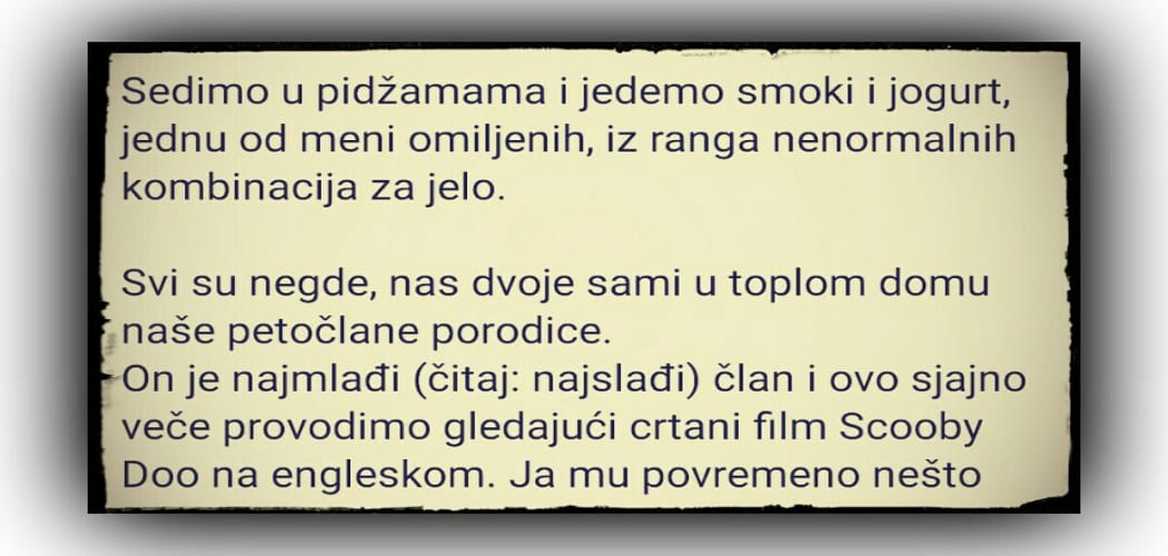 Sedimo u pidžamama i jedemo smoki i jogurt, jednu od meni omiljenih, iz ranga nenormalnih kombinacija za jelo. Svi su negde, nas dvoje sami u…