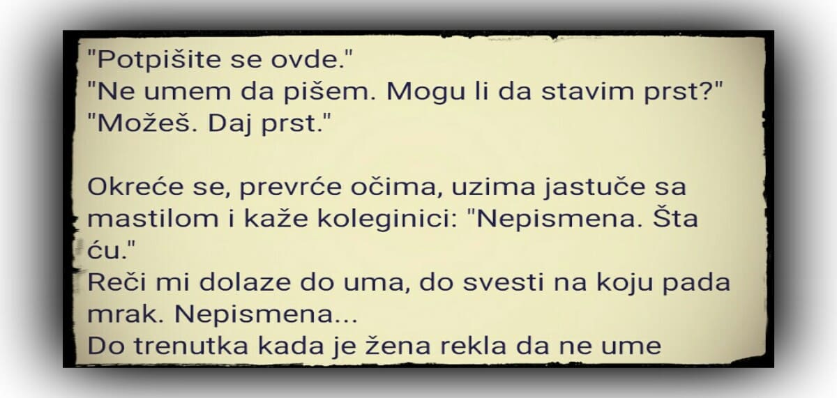 “Potpišite se ovde.” “Ne umem da pišem. Mogu li da stavim prst?” “Možeš. Daj prst.” Okreće se, prevrće očima, uzima jastuče sa mastilom i kaže…