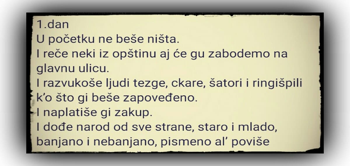 1.dan U početku ne beše ništa. I reče neki iz opštinu aj će gu zabodemo na glavnu ulicu. I razvukoše ljudi tezge, ckare, šatori i…