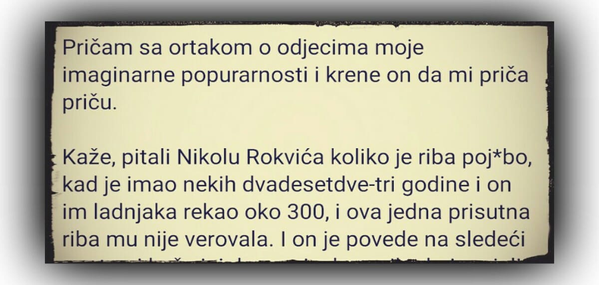 Pričam sa ortakom o odjecima moje imaginarne popularnosti i krene on da mi priča priču. Kaže, pitali Nikolu Rokvića koliko je riba poj*bo, kad je…