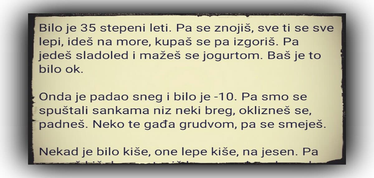 Bilo je 35 stepeni leti. Pa se znojiš, sve ti se sve lepi, ideš na more, kupaš se pa izgoriš. Pa jedeš sladoled i mažeš…