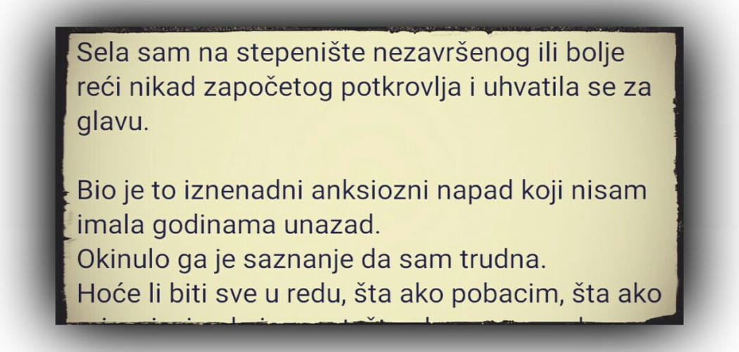 Sela sam na stepenište nezavršenog ili bolje reći nikad započetog potkrovlja i uhvatila se za glavu. Bio je to iznenadni anksiozni napad koji nisam imala…