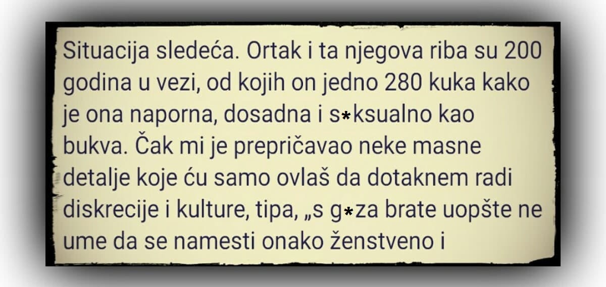 Situacija sledeća. Ortak i ta njegova riba su 200 godina u vezi, od kojih on jedno 280 kuka kako je ona naporna, dosadna i seksualno…