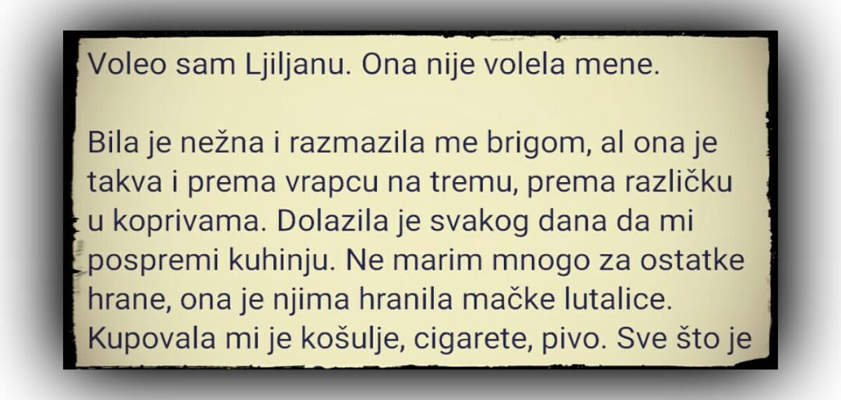 Voleo sam Ljiljanu. Ona nije volela mene. Bila je nežna i razmazila me brigom, al ona je takva i prema vrapcu na tremu, prema različku…