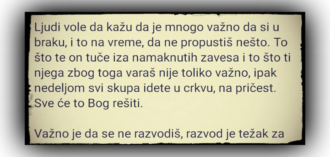 Ljudi vole da kažu da je mnogo važno da si u braku, i to na vreme, da ne propustiš nešto. To što te on tuče…