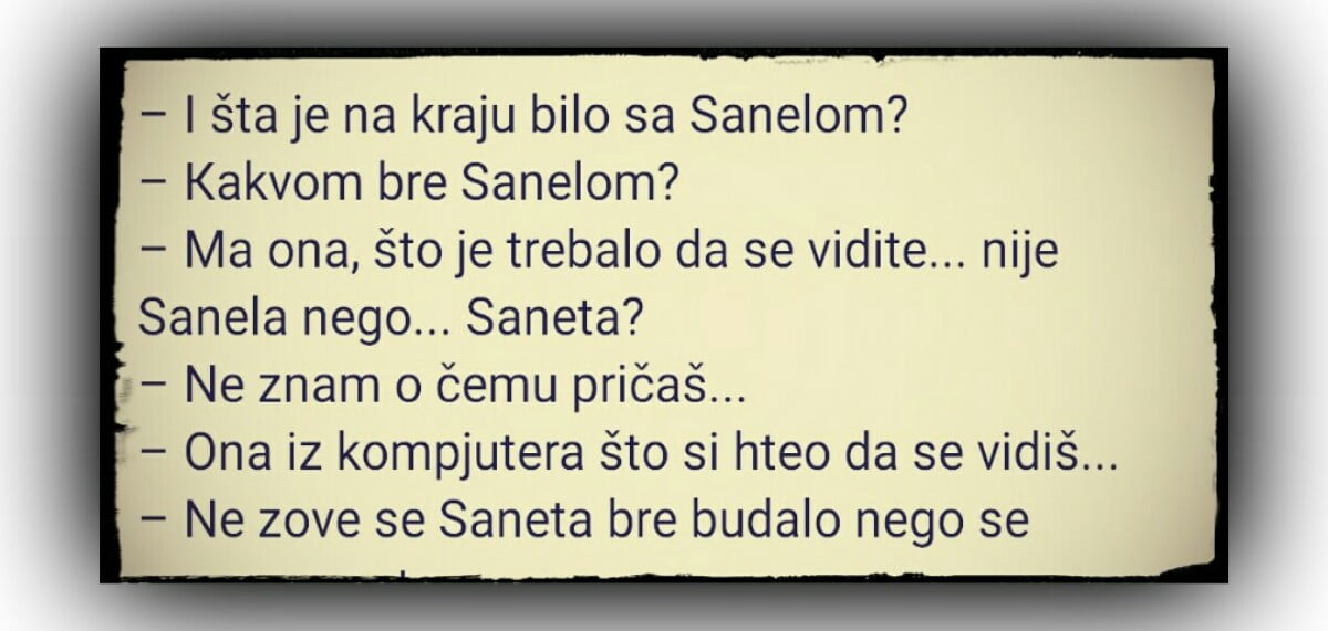 – I šta je na kraju bilo sa Sanelom? – Кakvom bre Sanelom? – Ma ona, što je trebalo da se vidite… nije Sanela nego……
