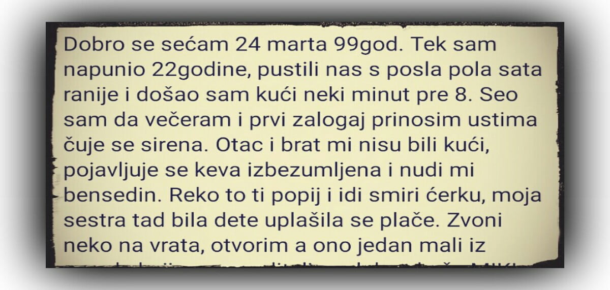Dobro se sećam 24 marta 99god. Tek sam napunio 22godine, pustili nas s posla pola sata ranije i došao sam kući neki minut pre 8.…