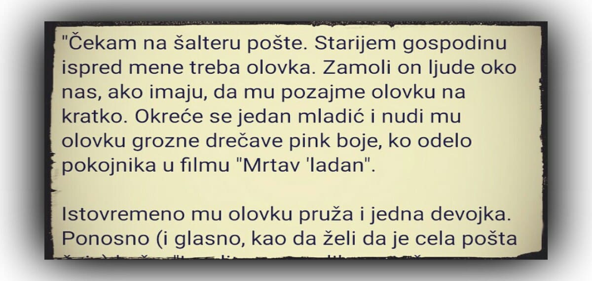 “Čekam na šalteru pošte. Starijem gospodinu ispred mene treba olovka. Zamoli on ljude oko nas, ako imaju, da mu pozajme olovku na kratko. Okreće se jedan mladić i nudi mu olovku grozne drečave pink boje, ko odelo pokojnika u filmu “Mrtav ‘ladan”.