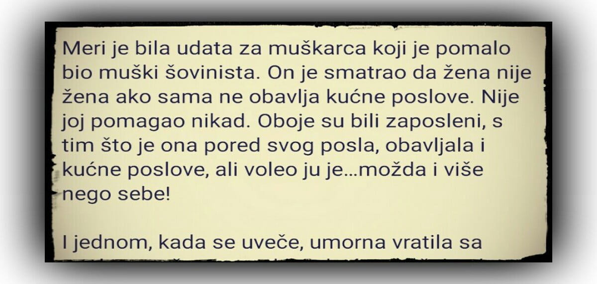 Meri je bila udata za muškarca koji je pomalo bio muški šovinista. On je smatrao da žena nije žena ako sama ne obavlja kućne poslove. Nije joj pomagao nikad. Oboje su bili zaposleni, s tim što je ona pored svog posla, obavljala i kućne poslove, ali voleo ju je…možda i više nego sebe!