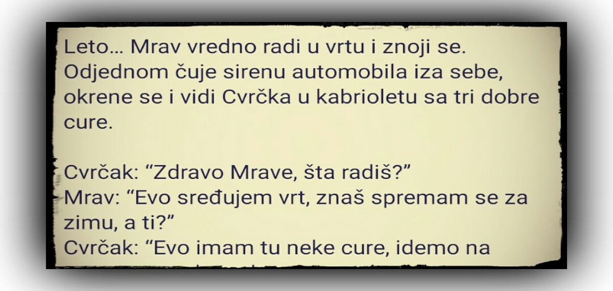 Zima… Mrav uživa u toploj sobi, izvalio se, gleda TV i polako gricka semenke. Čuje kucanje na vratima, otvori i vidi Cvrčka. Cvrčak u skijaškom odelu, ispred kuće džip, u džipu tri cure – ma boli glava!!!