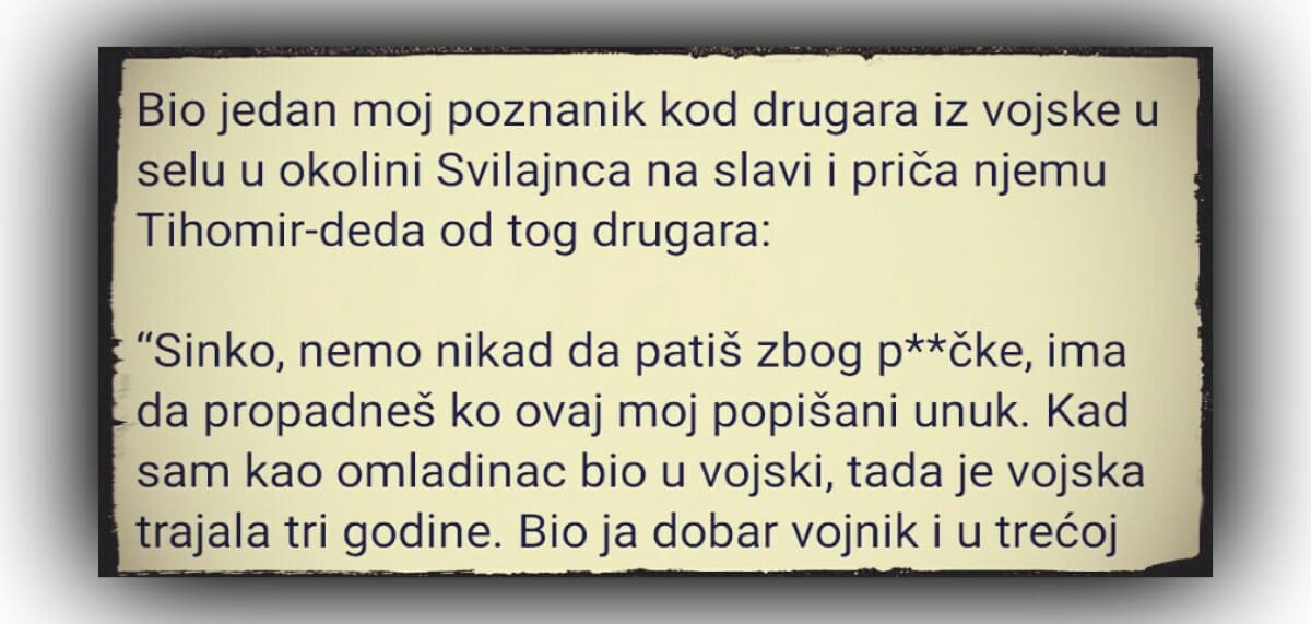 “Sinko, nemo nikad da patiš zbog p**čke, ima da propadneš ko ovaj moj popišani unuk. Kad sam kao omladinac bio u vojski, tada je vojska trajala tri godine. Bio ja dobar vojnik i u trećoj godini službe vodim ja mladu vojsku ka kasarni u Jagodini, kad iz jednog sokaka trči moja verena žena i viče: